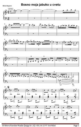 Veliki izbor notnih zapisa popularanih narodnih pesama. Note radjene u dva linijska sistema sa komplet ornamentikom (trilerima) basovima leve ruke i akordima.